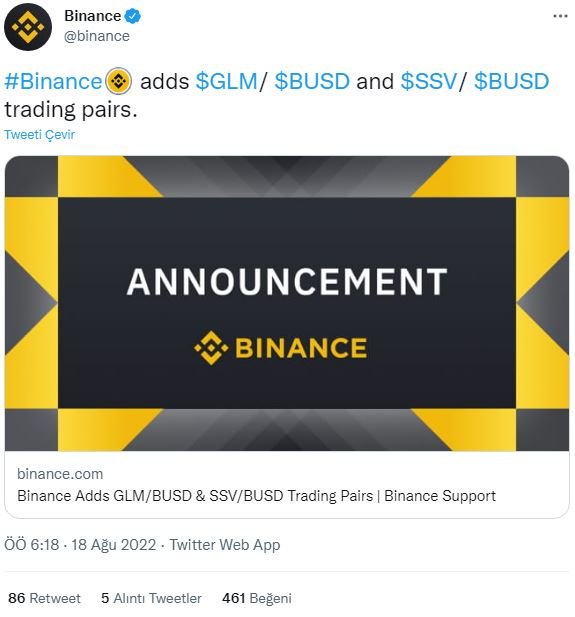 Duyuruya göre yatırımcılar,Türkiye saatiyle yarın 11.00‘dan itibaren GLM/BUSD ve SSV/BUSD işlem çiftleri ile alım-satım işlemlerine başlayabilecek.