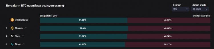 Bitcoin odaklı geçtiğimiz 12 saati kapsayan short/long pozisyonu verilere baktığımızda ise kullanıcıların %51,28‘lik oranda long, %48,72‘lik oranda short yönlü pozisyon aldığı ortaya çıkıyor.