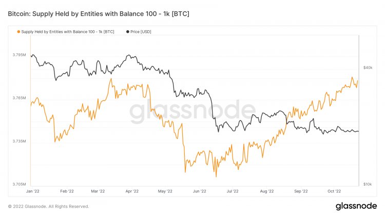 Ortalama 40 gündür 2.000 dolarlık bir aralıkta hareketine geçindiren Bitcoin’in bu sürecinde balinalar BTC biriktiriyor. On-Chain veri ve analitik platformu Glassnode’un verilerine nazaran 100 ila 1000 Bitcoin’i bulunan hesapların net BTC arzı haziran ayından bu yana yükseliş gösterdi.