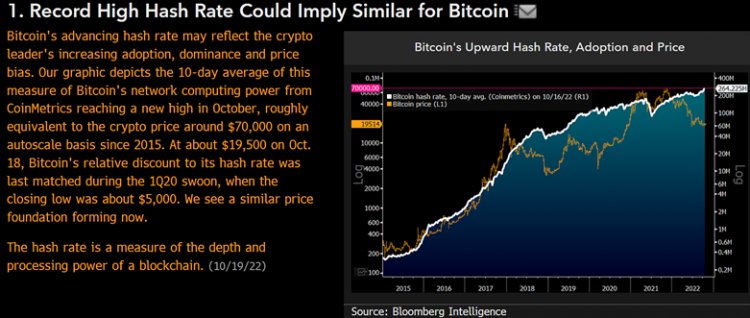 McGlone 19 Ekim tarihinde Twitter üzerinden yaptığı paylaşımda, “Bitcoin’in devamlı artan hash rate’ini” blockchainin enerjisinin ve güvenliğinin bir ölçüsü olarak tanımladı. Mevcut hash rate seviyesinde Bitcoin’in 70.000 dolar olması icap ettiğini gösteren bir grafik paylaştı.