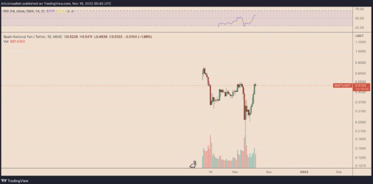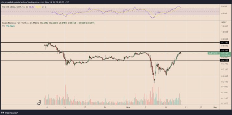 Bununla birlikte, İspanya milli takımının art arda kazandığı takdirde, aşağıdaki dört saatlik grafikte gösterildiği gibi, SNFT fiyatını mevcut direnç seviyesi olan 0,538 doların üzerine çıkarabilir ve 0,718 dolar seviyesine yakın rekor seviyeye doğru potansiyel bir artış sağlayabilir.