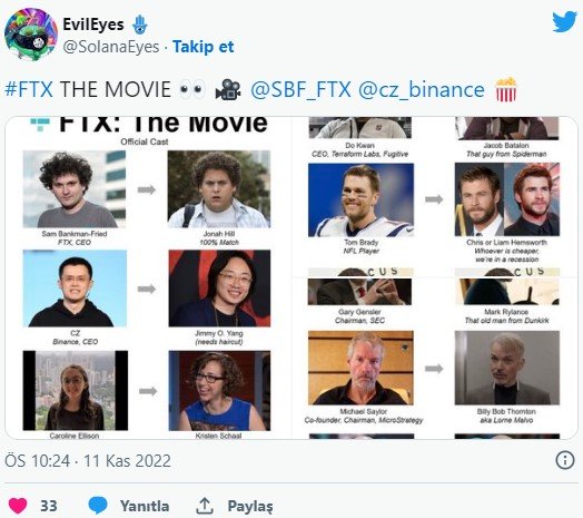 Bir Twitter kullanıcısı, 12 Kasım tarihinde paylaştığı bir ‘tweet’te SBF karakterini oynaması için Wolf of Wall Street’te rol alan Jonah Hill'i ve Changpeng Zhao'yu ise komedyen Jimmy O. Yang'i seçerek “FTX THE MOVIE” fikrini öne sürdü.