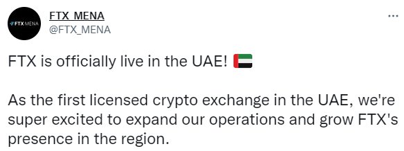 Temmuz ayında lisans alan Bahamalar merkezli popüler bir dijital varlık borsası olan FTX, 31 Ekim 2022'de Birleşik Arap Emirlikleri'ndeki operasyonunun açıldığını duyurdu. Yakın tarihli bir tweet'e göre FTX, resmi olarak BAE'nin ilk lisanslı kripto para birimi. FTX borsa şirketi ve hizmetlerini BAE'de başlatan ilk kripto para borsası.