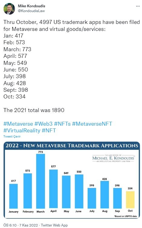 Lisanslı ticari marka avukatı Mike Kondoudis'in derlediği verilere göre, dijital para birimleri ile ilgili ürün ve hizmetler için yapılan ticari marka başvurularının sayısı, Ekim 2022 sonu itibariyle 4.708'e ulaştı ve 2021'de yapılan toplam 3.547 başvuru sayısını geçti.
