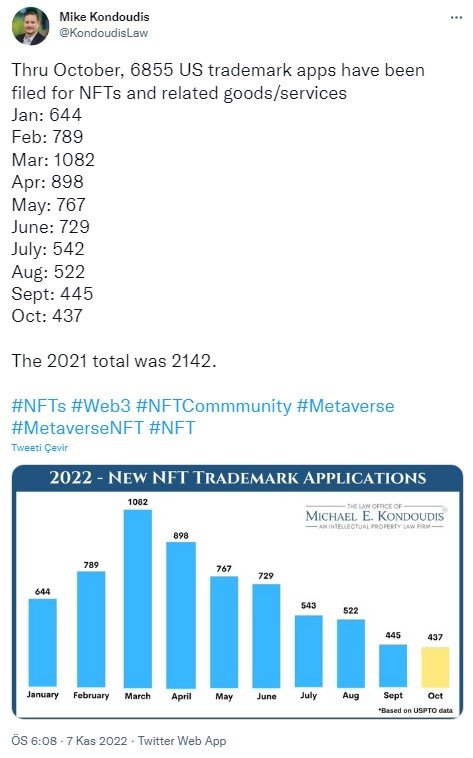NFT ticaret hacminde ve satışlarındaki düşüşe rağmen, teknolojiye yönelik istek de gün geçtikçe artıyor gibi görünüyor. Kondoudis'in istatistiklerine göre NFT'ler ve ilgili ürünleri için 2021'de kaydedilen 2.142 toplam ticari marka başvurusu sayısı Ekim 2022'ye kadar 6.855'e yükseldi.