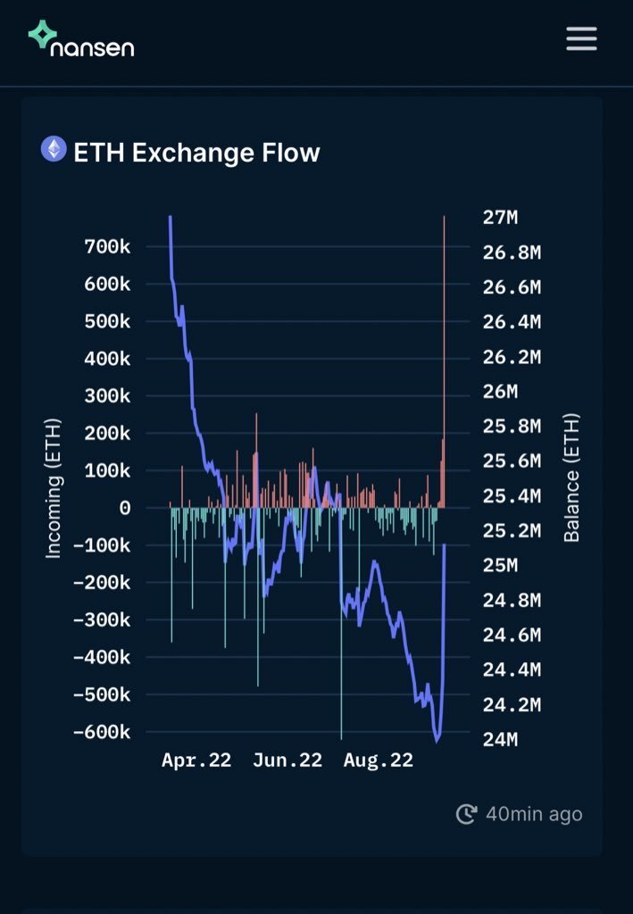Veri ve analitik şirketi Nansen’e göre, Merge öncesi borsalara Ethereum girişi arttı. Nansen CEO’su Alex Svanevik, 15 Eylül tarihinde yaptığı bir paylaşımda borsalara Ethereum girişinin son 6 ayın en yüksek seviyesine ulaştığını söyledi. Nansen CEO’su ayrıca, Binance’e 720 milyon dolar değerinde 450.000 Ethereum transfer edildiğini belirtti.